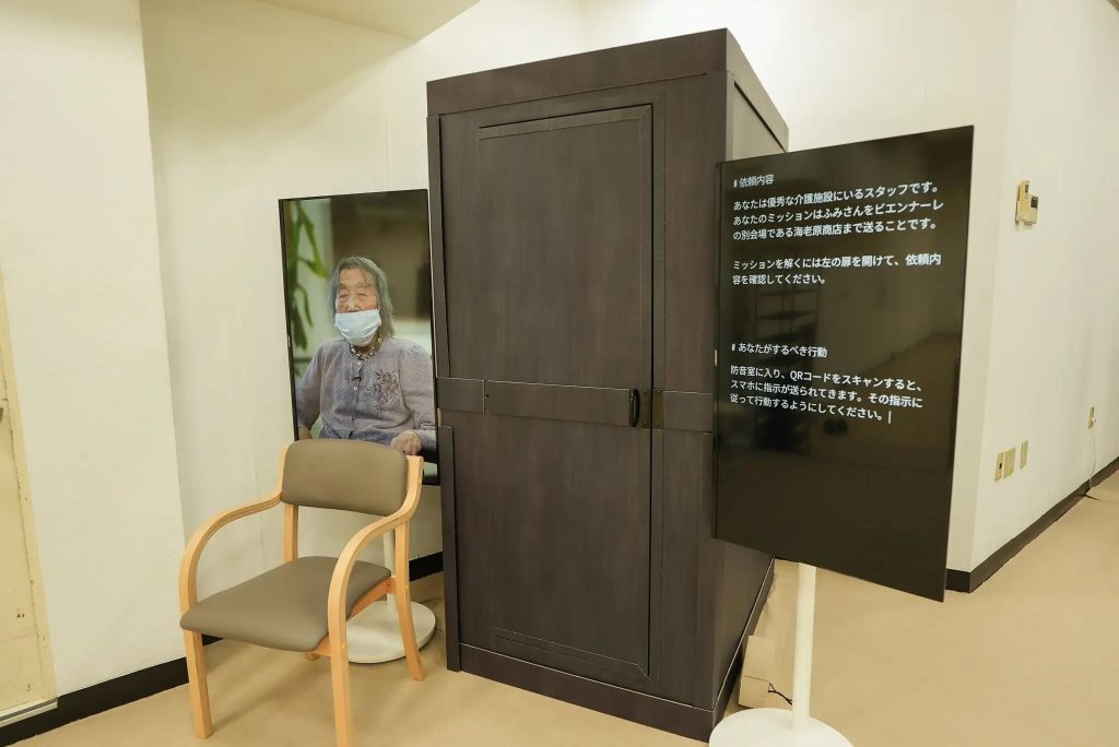 For this project, Kubota presents his installation created based on the memory of spending time with his grandmother. He states, “when I was little, I loved watching the TV comedy program Shoten with my grandmother while eating mikan oranges by the kotatsu (blanketed table).” In this work, Kubota created a piece while holding that memory close, which screens footage of interviews with dementia patients, then provides a simulated experience of “wandering” (also known as walking or explorative behavior) observed in this condition.
