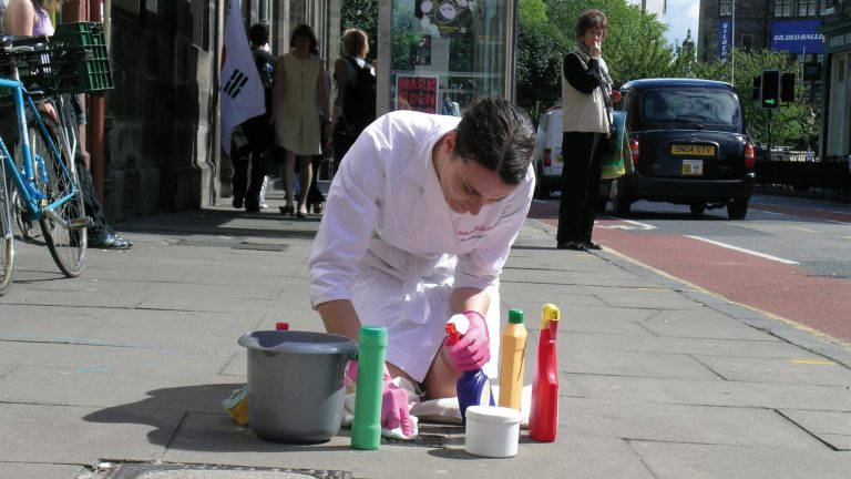 Her Alter Ego, the Urban Beautician, tries to improve neglected details in our urban environment with non-intrusive interventions in public space and performances to camera. She takes care of things no one else does. These overlooked details in urban space gain a new breath of life through performance, installations, video and photography.