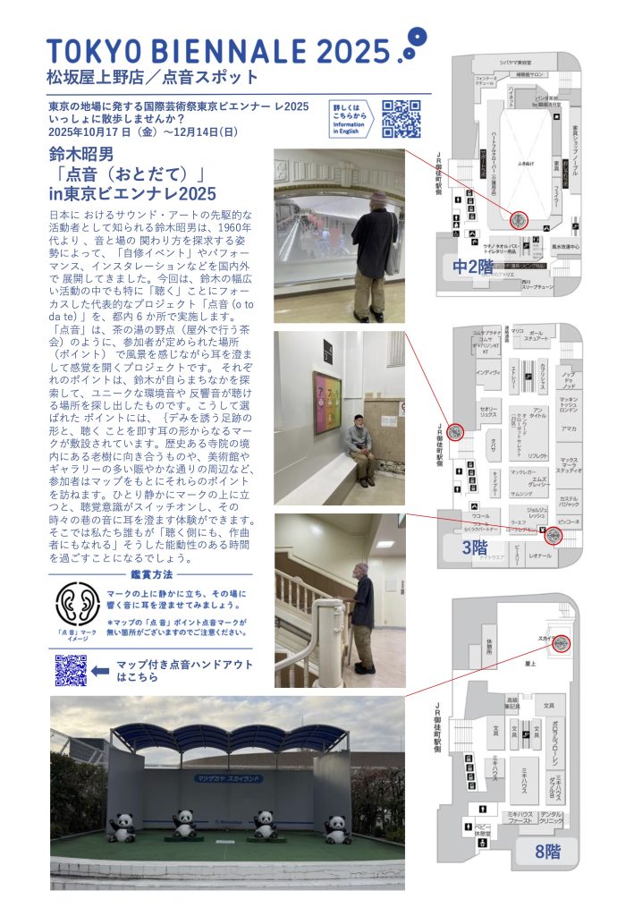 サウンドアーティスト鈴木昭男の「『点 音(おとだて)』in 東京ビエンナーレ 2025」は、アーティストが選んだ都内各所のポイントに参加者が訪れ、茶の湯の野点(屋外で行う茶会)のように、風景を感じながら耳を澄まして感覚を開くプロジェクトです。このたび松坂屋上野店内で既存の3か所に加え、4か所目のポイントが8階スカイランドにて公開されました。上野らしさも感じられる、かわいいパンダ像が並ぶ場所です。